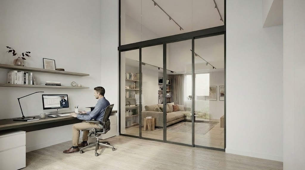 Define your workspace while staying connected to your home with flexible glass partitions.