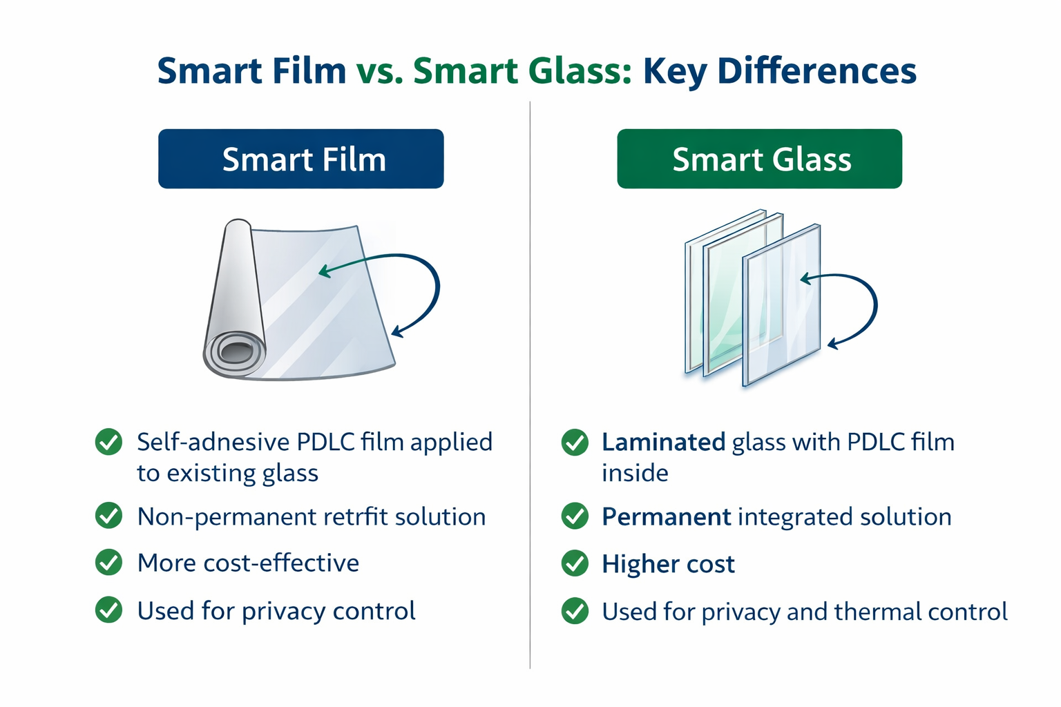 Understand the key differences between smart film and smart glass. Learn which solution is best for your project based on installation, cost, performance, and use cases.